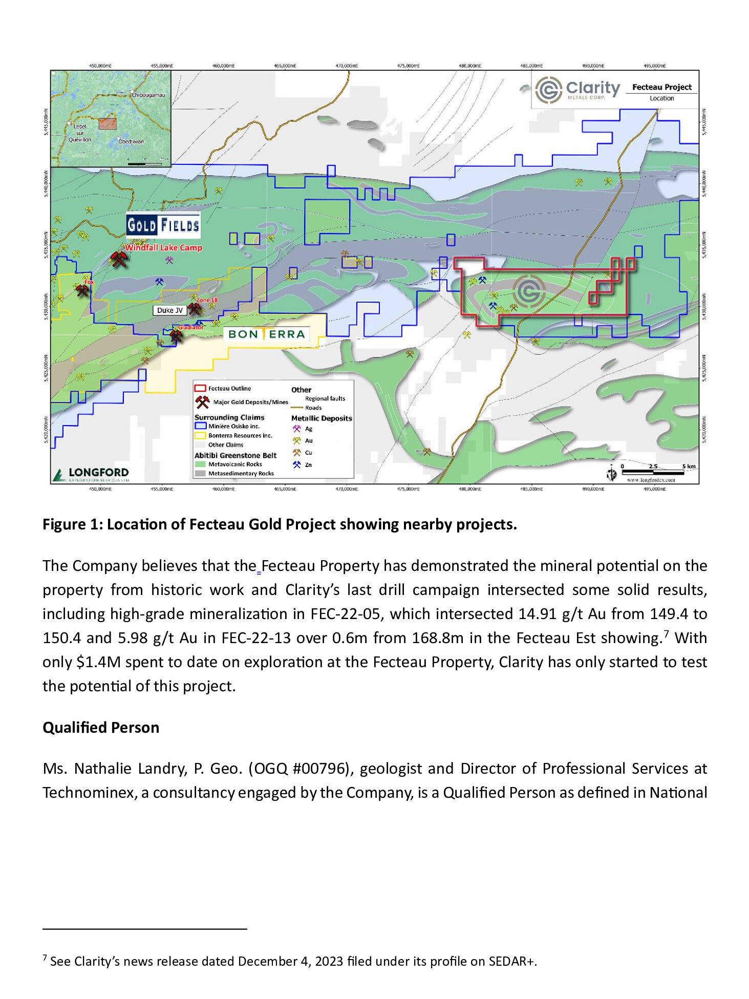 The Company believes that the Fecteau Property has demonstrated the mineral potential on the property from historic work and Clarity’s last drill campaign intersected some solid results, including high-grade mineralization in FEC-22-05, which intersected 14.91 g/t Au from 149.4 to 150.4 and 5.98 g/t Au in FEC-22-13 over 0.6m from 168.8m in the Fecteau Est showing.7 With only $1.4M spent to date on exploration at the Fecteau Property, Clarity has only started to test the potential of this project.